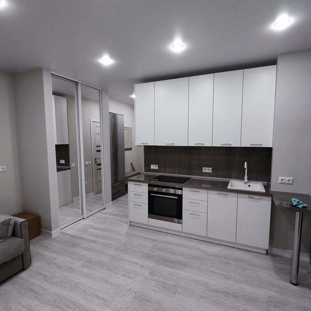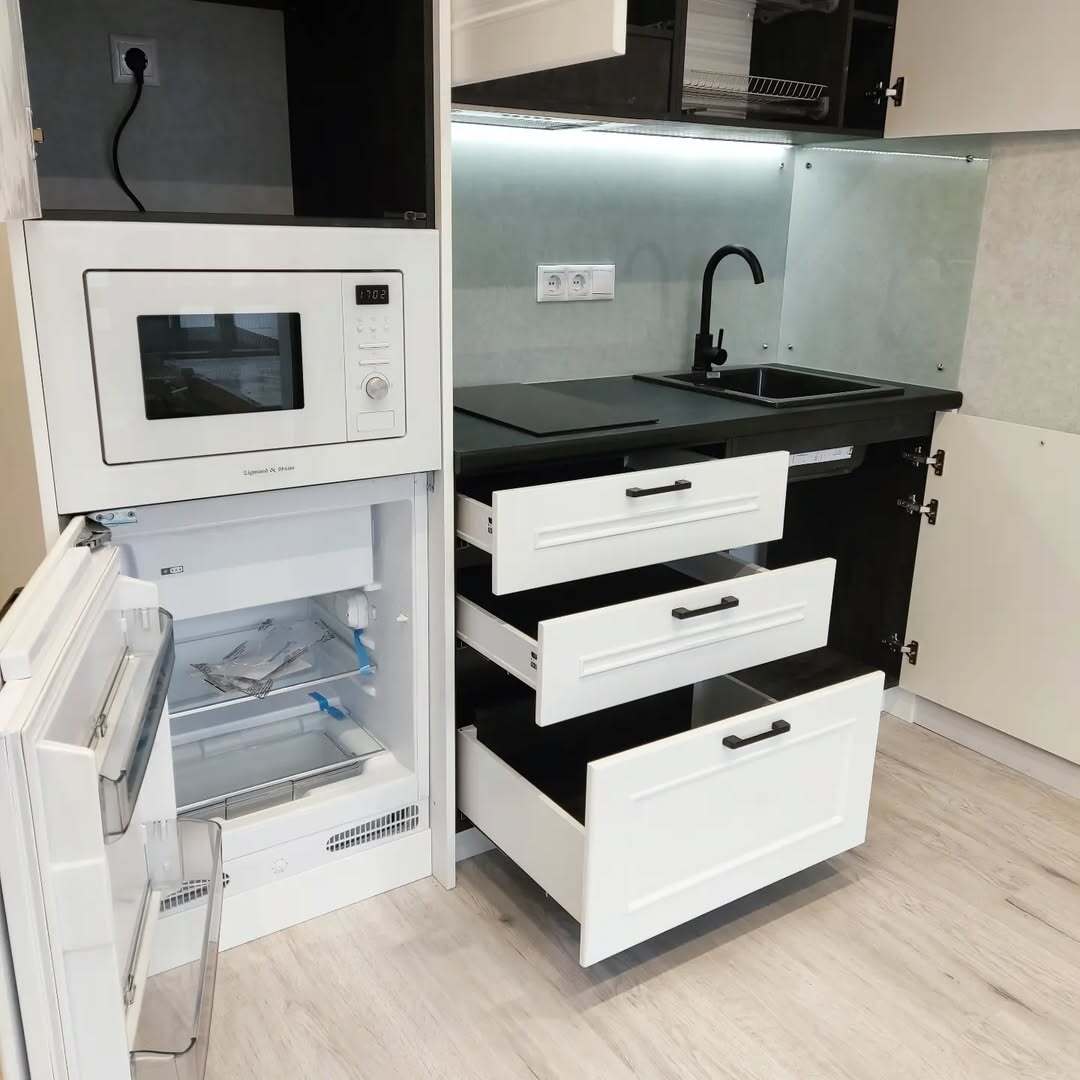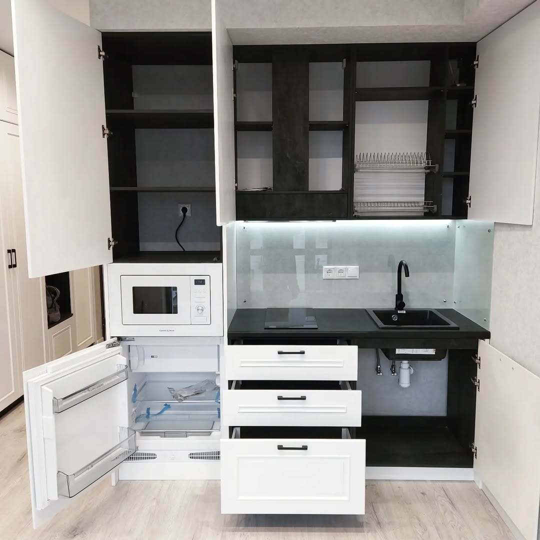 Небольшая квартира-студия в одном из самых популярных жк города сочи. клиент обратился к нам, находясь в другом городе, по рекомендации. Задача стояла сделать всё в одном стиле, красиво и недорого. В проекте используется фасад AGT и чёрный профиль GOLA, а так же чёрный профиль для шкафов-купе futurum.